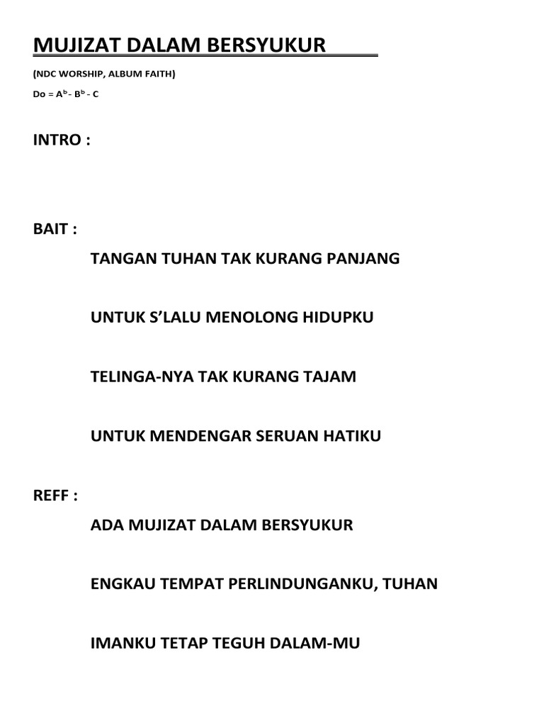 Ada mujizat dalam bersyukur Engkau Tempat Perlindunganku Tuhan Imanku tetap teguh dalamMu ku menang ku menang bersamaMu. Lirik Lagu Mujizat Dalam Bersyukur - NDC Worship. Ku melakukan sgala sesuatu Hanya dalam namaMu Kaulah sumber Pertolongan hidupku.